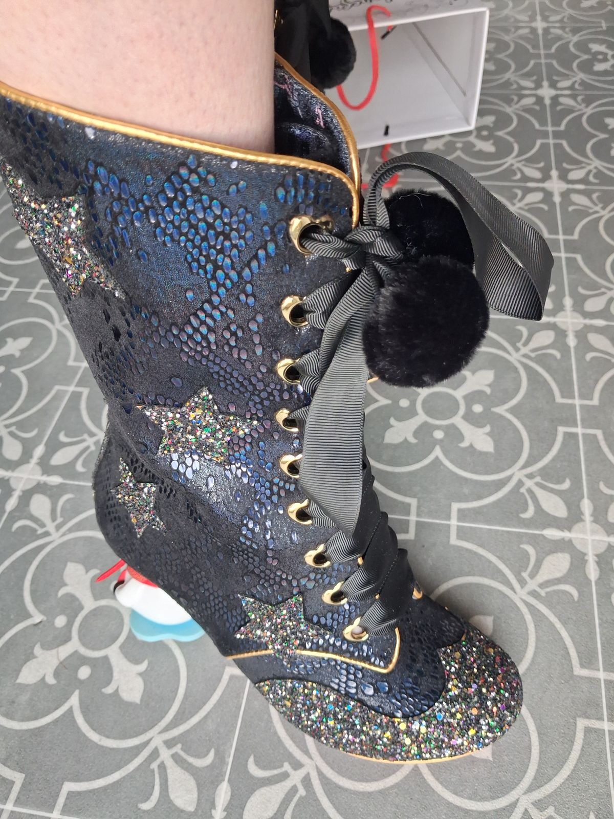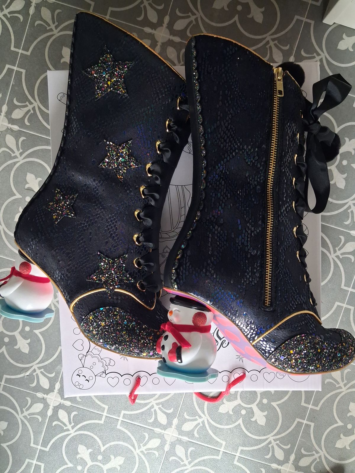 Bringing you all the Victorian Christmas realness, these stunning midnight blue calf-high lace up boots are decorated with sparkling black and multicolour glitter stars, luxe grosgrain pom pom trimmed laces and shiny heart shaped eyelets. Peeping out from below is our brand new hand painted cheeky IC the Snowman concept high heel, adding a touch of festive cute whimsy to this otherwise prim and proper style. These boots will be the festive miracle for all of your holiday parties!